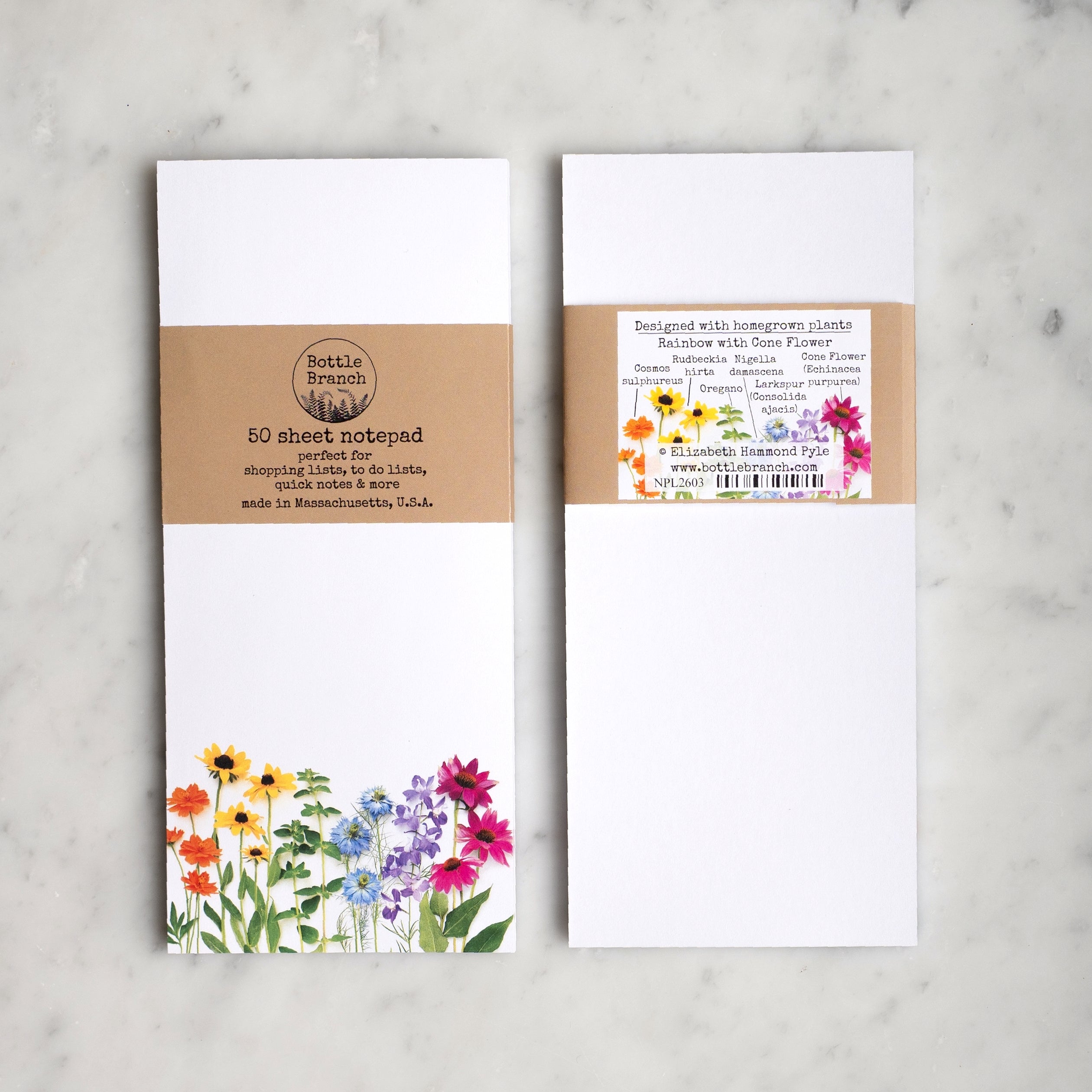 This large notepad features colorful flowers in original Bottle Branch photography, combining cheerful blooms with a classic botanical aesthetic.