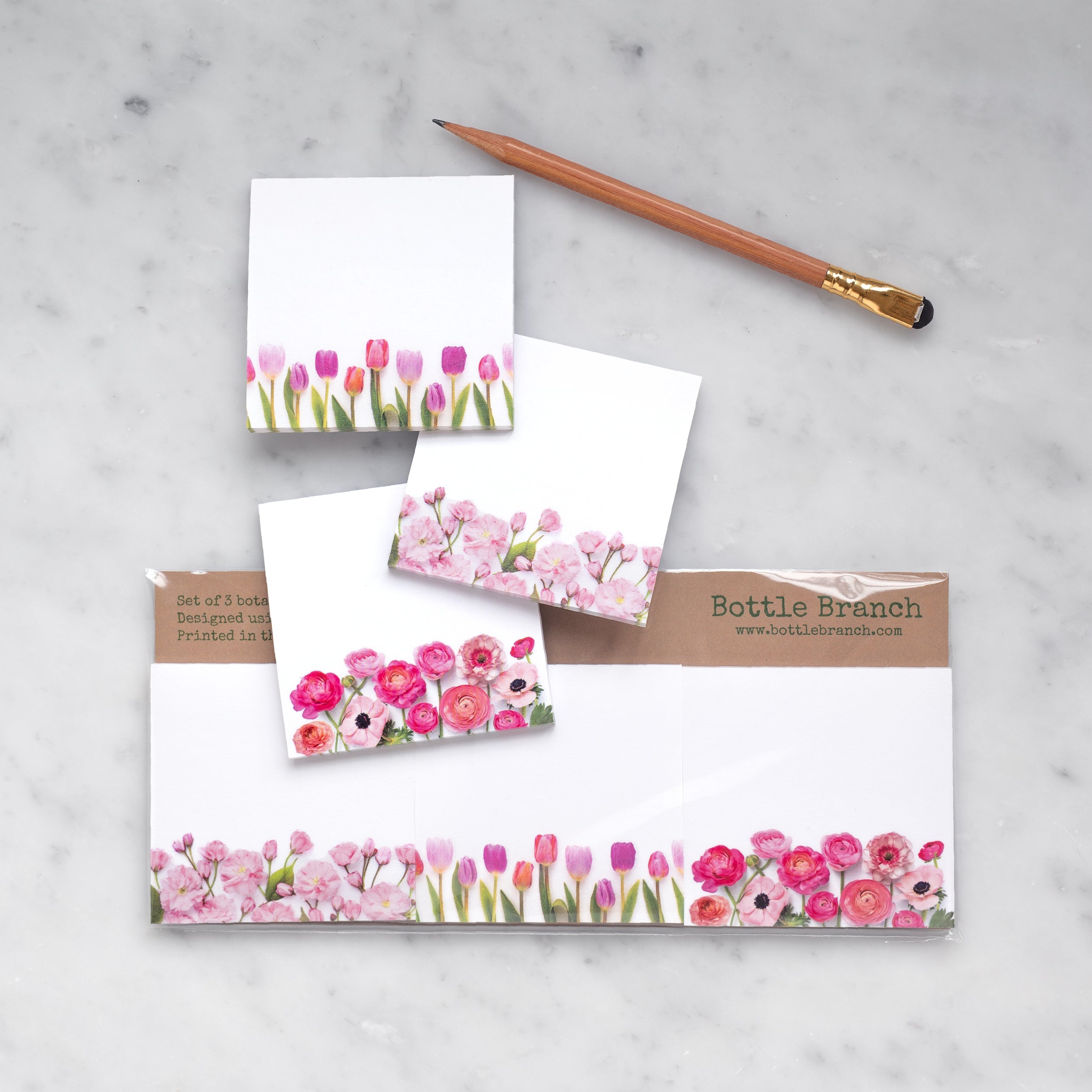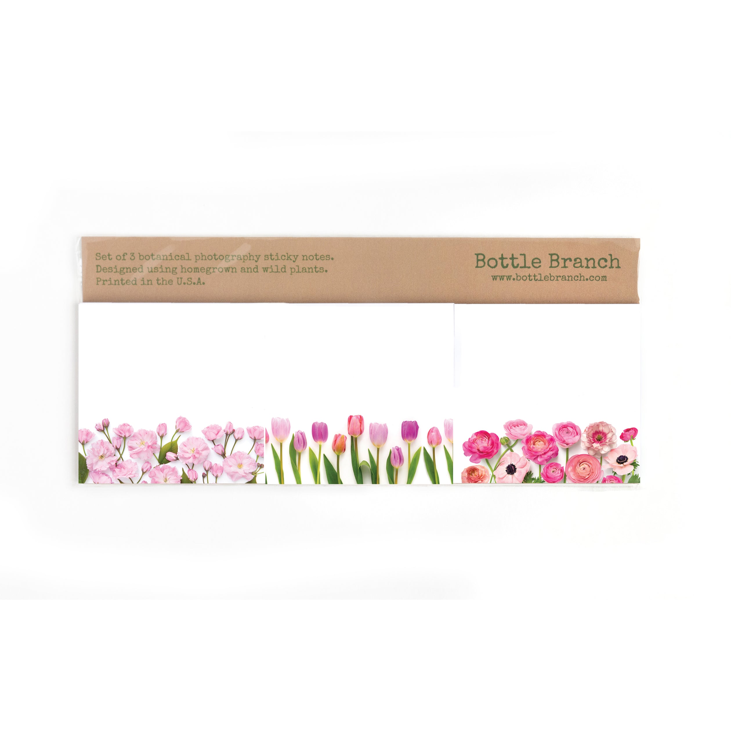 Pack of 3 sticky note pads in pretty botanical designs. 50 sheets per pad. Each sheet printed with a beautiful botanical photo - a little garden blooming on every message.