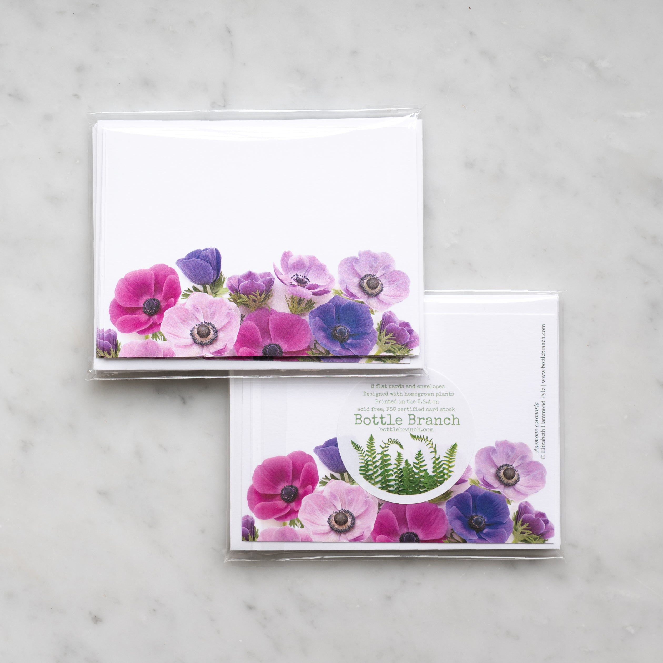 Set of eight flat botanical cards featuring anemone flowers. Printed on an appealingly soft and hefty card stock. Flat, not folding, design is perfect for the quick, casual notes. .