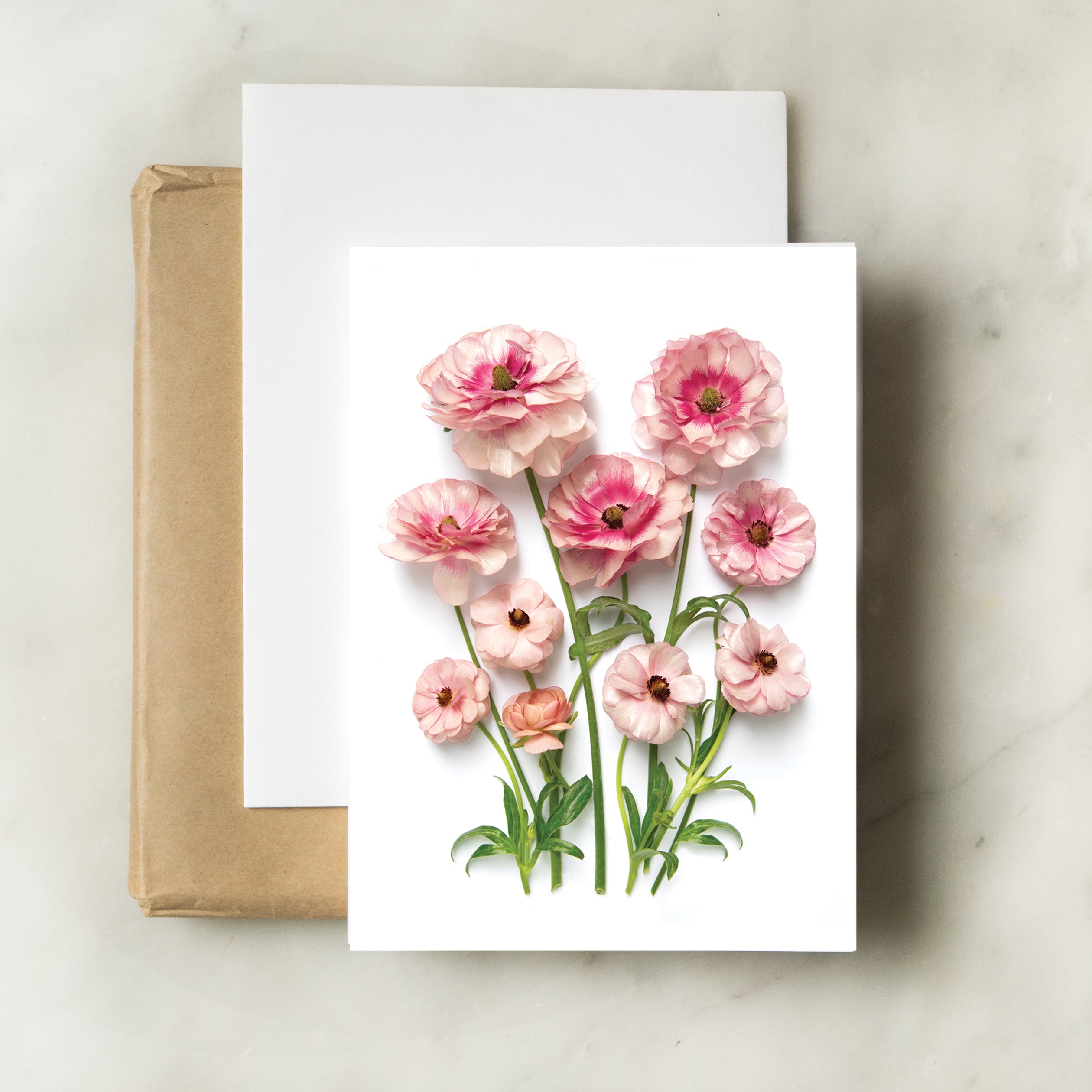 This card features butterfly ranunculus flowers on the front and a blank inside. Created using homegrown plants and contemporary photography techniques. Printed on an appealingly soft and hefty card stock. Rear caption lists plants depicted on front.