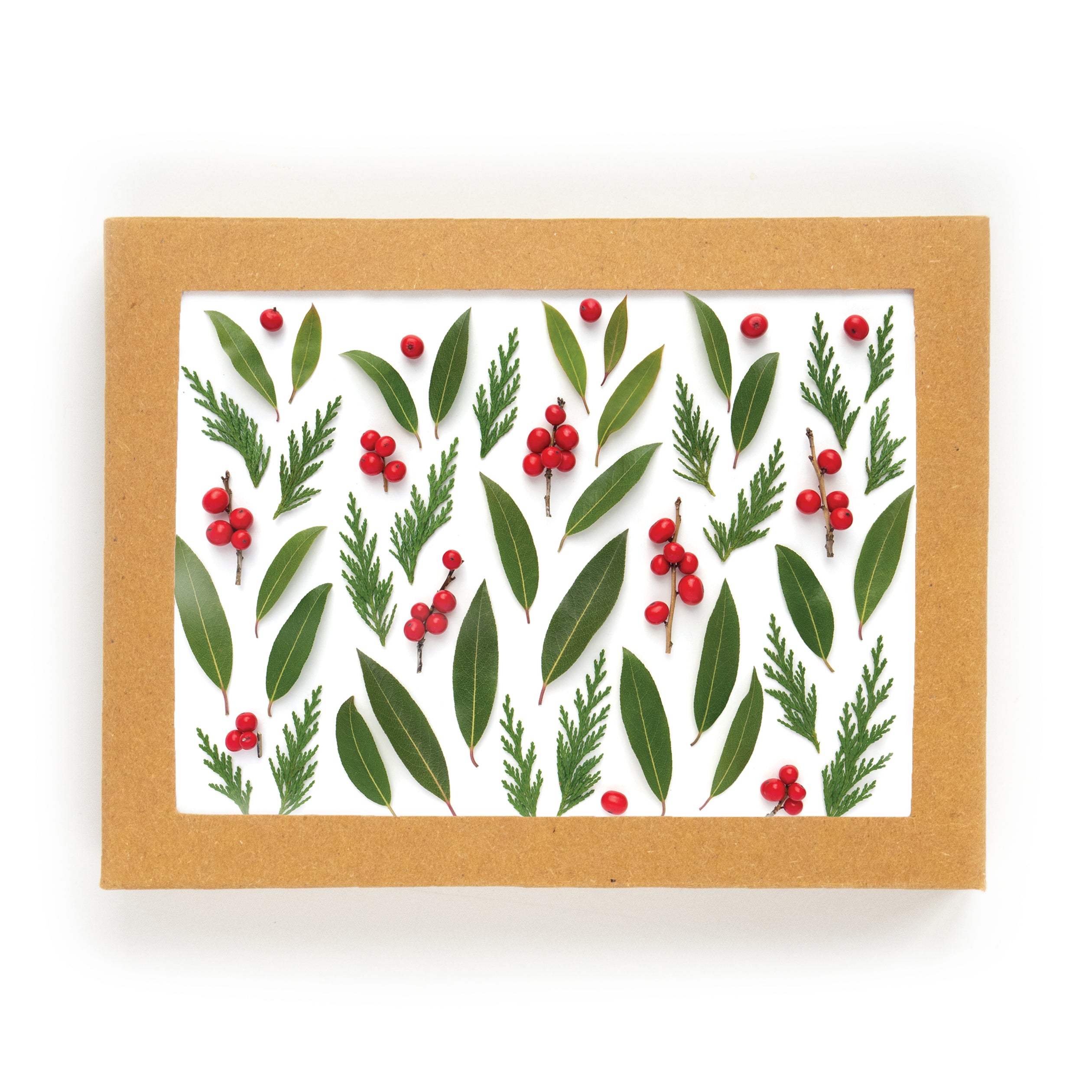 Set of eight luxurious folding cards featuring winterberries and evergreens in a modern, light pattern. Created using real plant material and contemporary photography techniques. Eight cards with matching envelopes. Packaged susatainably in a kraft paper box with a sticker on the rear showing a preview of cards contained inside and pertinent information about the cards - 130# , FSC certified card stock, made in the U.S.A