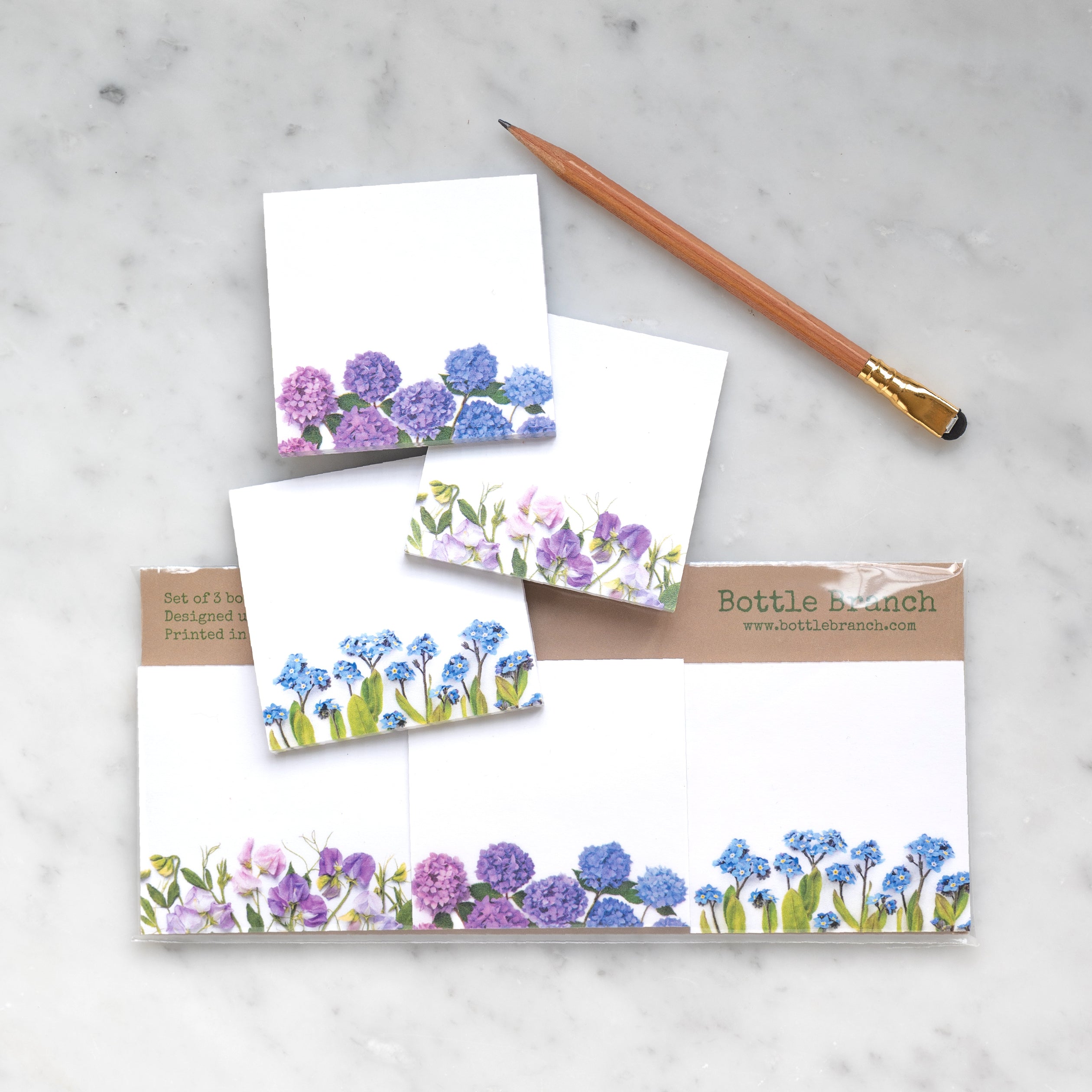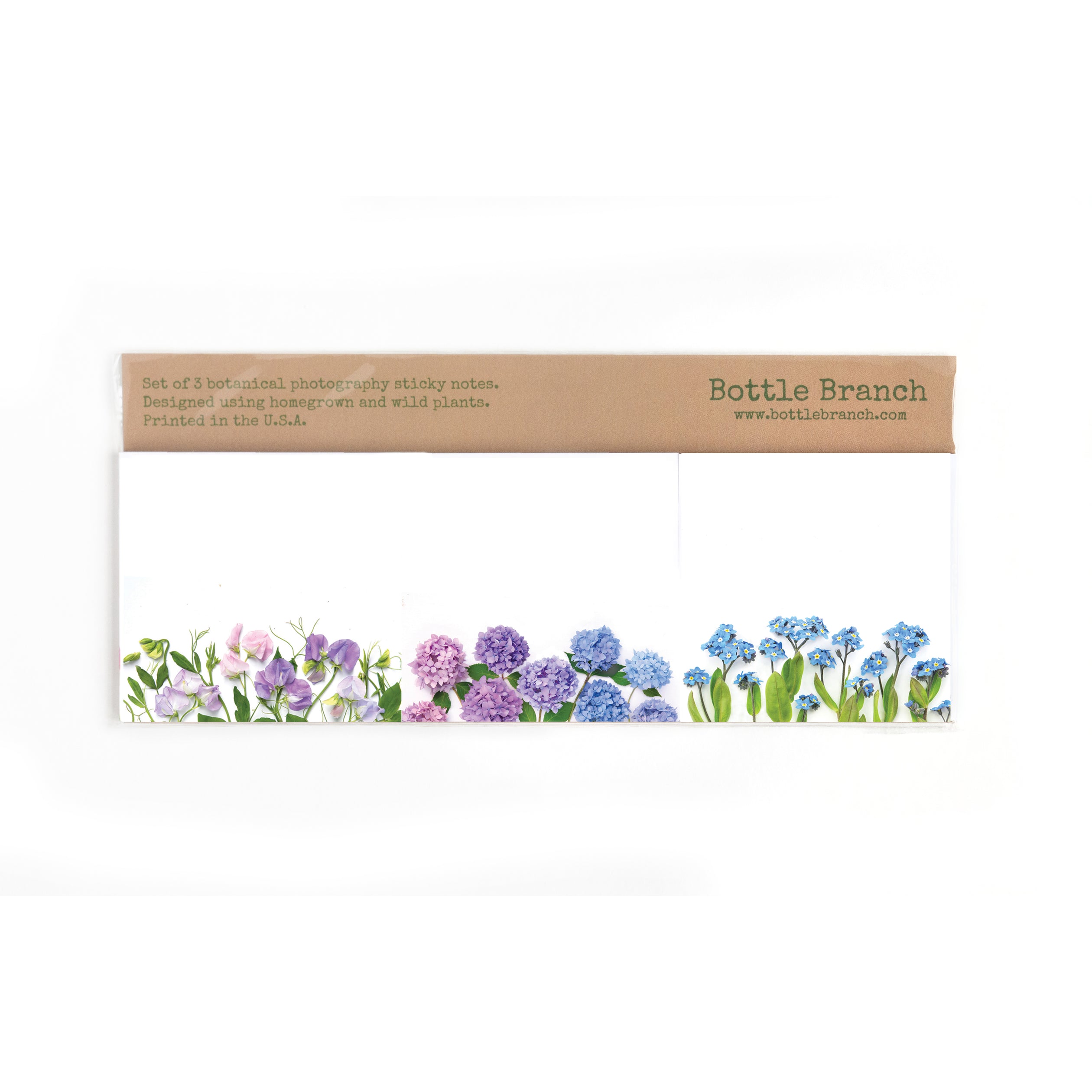 Pack of 3 sticky note pads in pretty botanical designs. 50 sheets per pad. Each sheet printed with a beautiful botanical photo - a little garden blooming on every message.